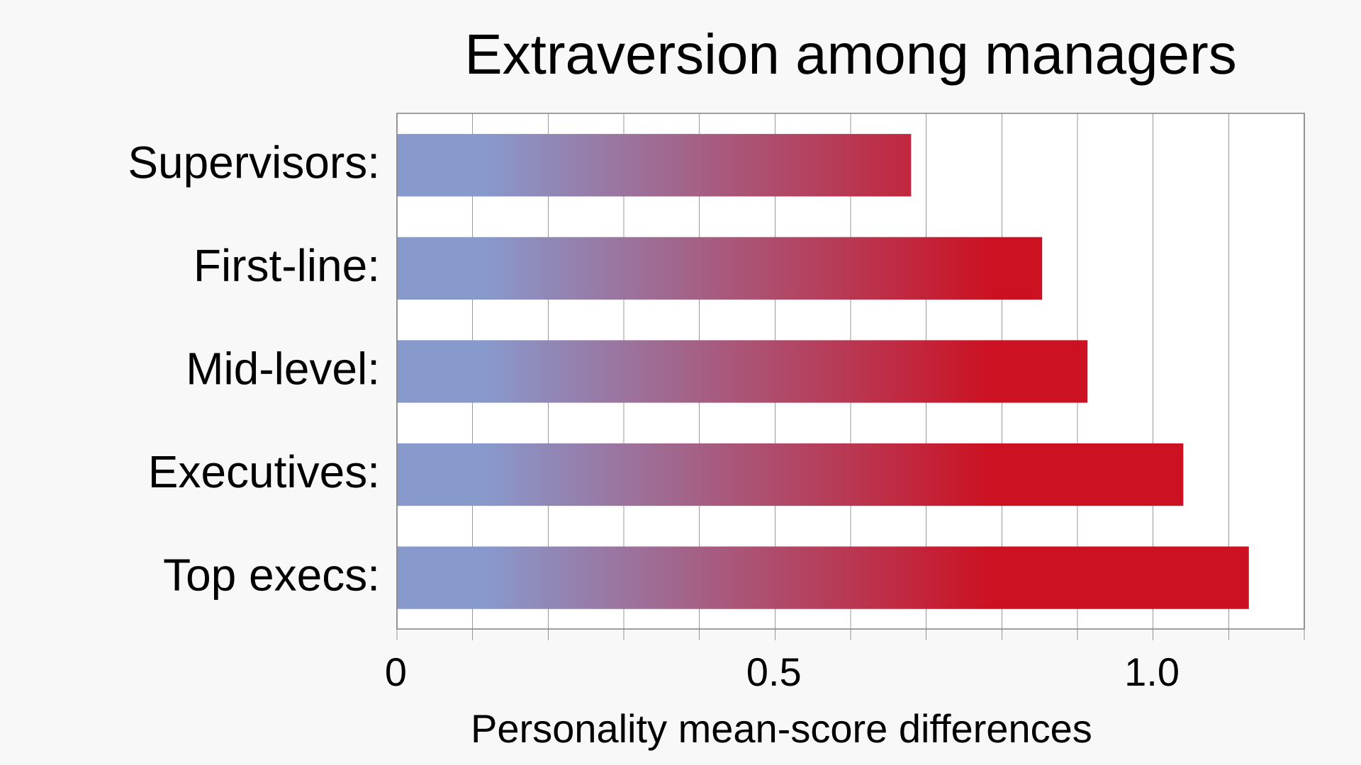 Research indicates that the prevalence of extraversion is greater for people at progressively higher management levels.